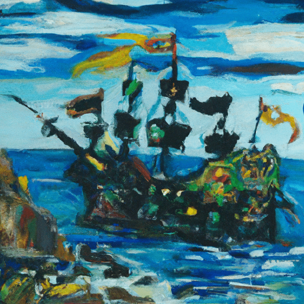 Prompt: Impressionism: A vibrant and dynamic painting set in the Golden Age of Pirates. The image features an AI-driven robot pirate, adorned in colorful attire and wielding a futuristic cutlass. The scene showcases a pirate ship with billowing sails, surrounded by shimmering waves and scattered treasures. The impressionistic brushstrokes capture the energy and movement of the AI robot pirate, while the vibrant colors evoke a sense of adventure and imagination.
