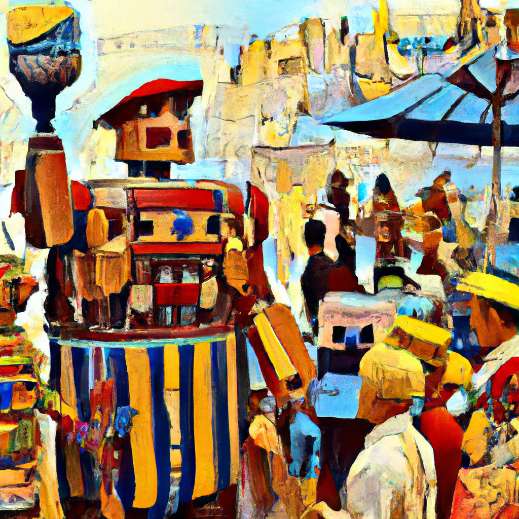 Prompt: For this unique image in the style of Impressionism, we see a bustling scene in a Golden Age era market, but with a twist. An AI Robot Pirate, hulking and intricate, is in this colorful scene, delivering groceries. The robot is humanoid with piratical elements such as a tricorn hat, an eyepatch, and a hook hand. It’s unloading crates from a futuristic ship, marked with recognizable grocery logos. Groceries are a mix of traditional produce and high-tech items, showing the mix of old and new. Shoppers walk by in 18th century clothing, some shocked and others nonchalant, illustrating the muddled reaction society often has towards progress. The brushstrokes are bold and the colors vibrant, suggesting the whirlwind of emotions that emanate from this anachronistic scene.