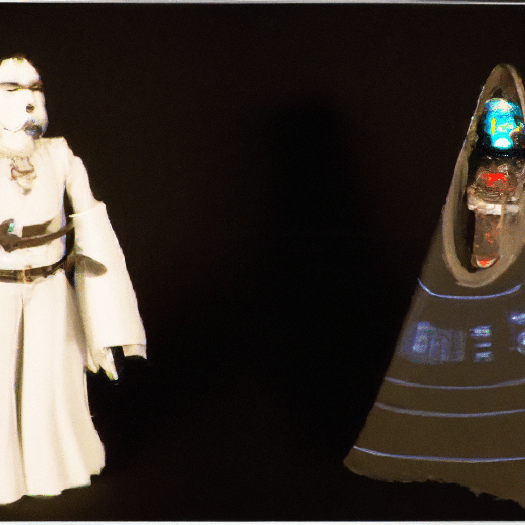 Prompt: In the style of Romanticism, imagine a candlelit scene on an 18th-century ship. An AI robot pirate, distinguishable by a metallic body, eye patch, and tricorn hat, stands in the center with a digital, holographic heart glowing in its palm. Opposite each other are a male and female pirate, who cannot comprehend each other’s languages, but look at each other longingly. The robot, responsible for translating their dialogues is transcribing the text from their native tongues into a universally understood script, symbolizing the breaking of language barriers. The sky above them glows in the purple hues of twilight adorned with scattered stars, adding a romantic touch to the scene.