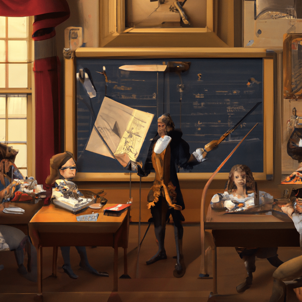Prompt: In the style of Realism, the image shows an organized, bustling 18th-century pirate ship classroom. Kids dressed as pirates are engaging with unique, antique-looking AI robot tutors, standing by blackboards, debating maps, and poring over ancient texts. A teacher is in the center using a futuristic AI grading tool, appearing as an old-fashioned quill, but glowing with light, grading a pile of parchment papers. Elements of the Golden Age of Pirates are evident in their outfits, the ship, and the maps, seamlessly integrating with high-tech AI aspects, symbolizing the blending of past and future.