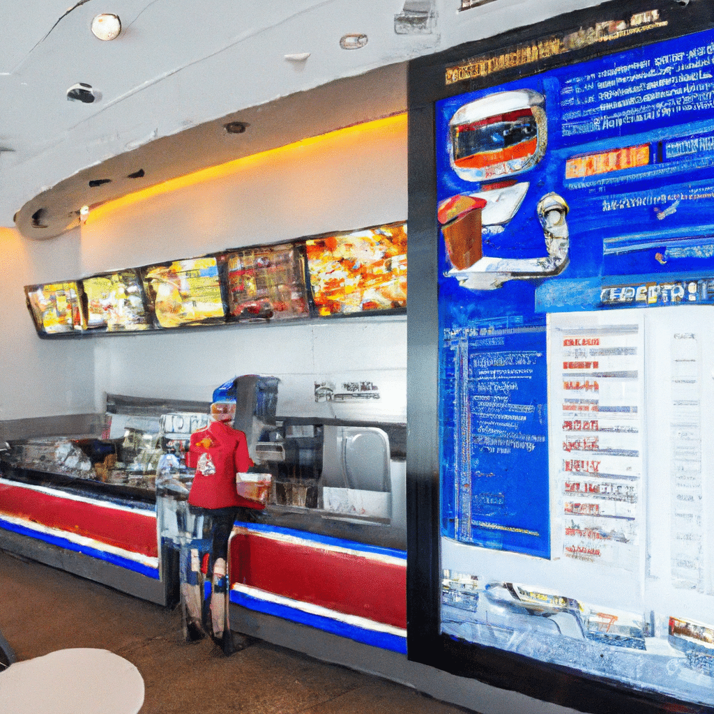Prompt: In the style of Futurism, the image will depict a modern Wendy’s fast-food restaurant bustling with activity. Central to the image is a sleek, metallic AI robot pirate with a hamburger-and-fries skull emblem on its bandana, manning the ordering counter with a touchscreen interface displaying fluctuating prices. Customers are seen interacting with the touchscreen, awestruck by the AI’s efficiency. In the backdrop is a digital signage showcasing AI-enabled menu changes, the items flashing and morphing as per demand and time. Futuristic elements mix with the warm, fast-food ambiance, symbolizing a revolutionary change.