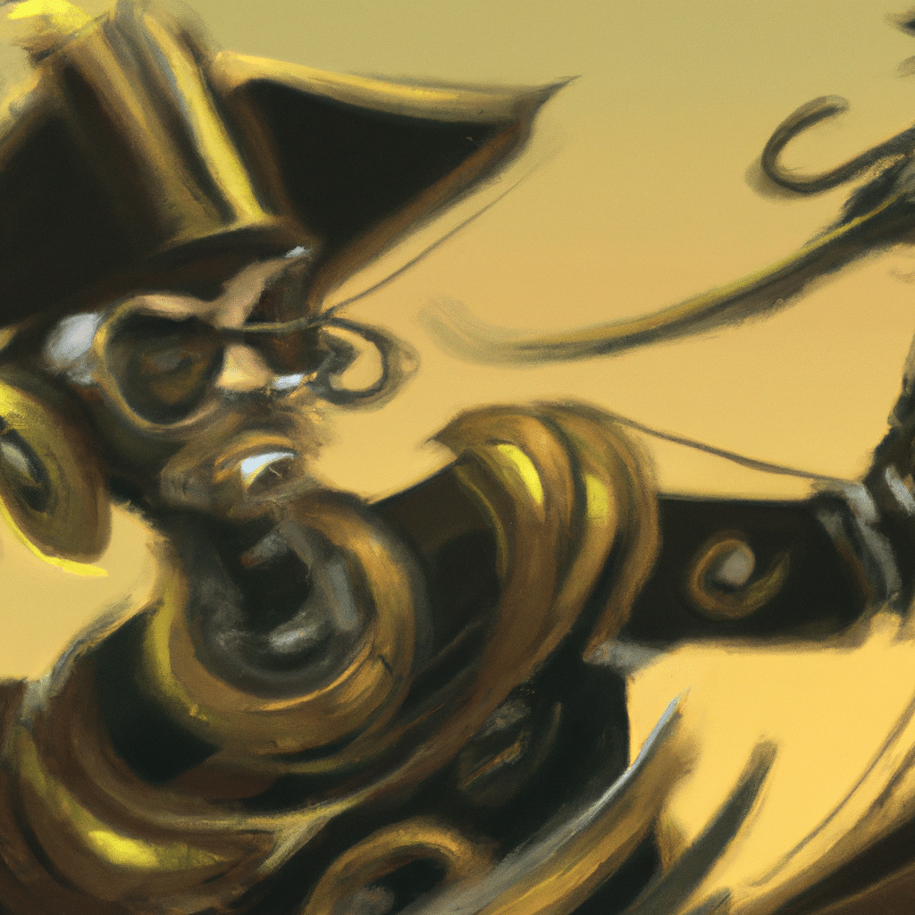 Prompt: This image would be painted in the style of Futurism, emphasizing dynamic motion, technology, and progress. The main focus will be an AI Robot Pirate, decked out in traditional Golden Age of Pirates garb – tricorn hat, eye patch, but instead of a hook, there’s a futuristic metallic hand.