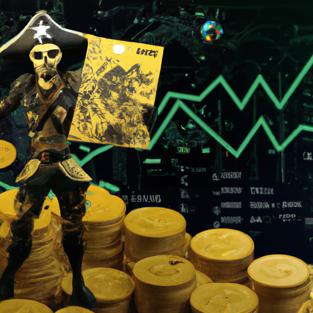 Prompt: The image would be created in the style of Futurism. It would depict a futuristic stock market scene. In the center is a dominating AI robot pirate, emblazoned with the Nvidia logo on its chest. The pirate is standing on a pile of golden coins symbolizing profit, holding a digital map revealing numerous upward trending graphs. The backdrop showcases an eco-friendly city, hinting at the sustainability aspect, powered by advanced technology. Flashing zeros and ones in the foreground evokes the essence of digital transformation. The color scheme merges cool metallic tones with vibrant green, signifying energy efficiency and technological dominance.