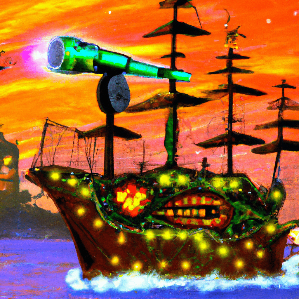 Prompt: In a vibrant futuristic style of art, the image features a bustling pirate ship floating amidst neon-lit clouds. The ship, adorned with mechanical enhancements, is manned by a crew of AI-powered robotic pirates. The ship’s captain, the CEO of OpenAI, stands tall on the deck, wearing a technological tricorn hat and holding a glowing sword. Surrounding the ship, new tools and technologies are unveiled, represented by holographic screens displaying intricate algorithms and code. The scene captures the excitement and energy of the Golden Age of Pirates, infused with the cutting-edge advancements of AI in a beautiful fusion of futurism and pirate folklore.