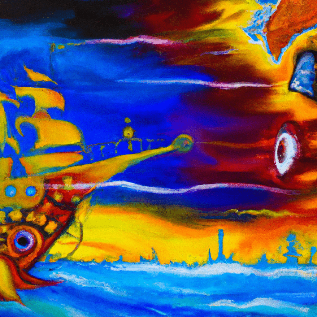 Prompt: Impressionism: A vibrant and energetic painting depicting a futuristic robot pirate ship sailing through choppy, technicolor seas. The ship’s sleek, metallic body is adorned with AI-inspired symbols and patterns, while billowing clouds of luminous steam surround it. The scene is bathed in an array of vivid colors, capturing the excitement and innovation brought by artificial intelligence during the Golden Age of Pirates.