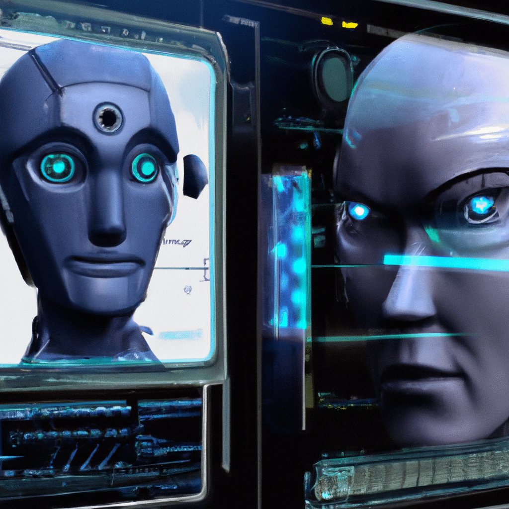 Prompt: In a Realism style, the image could highlight a contemporary scene with a surreal twist. It opens with a futuristic police station where a robotic officer, exemplifying artificial intelligence, is scrutinizing two monitors. The first monitor depicts a map filled with real-time faces being tracked, these faces have a touch of transparency to demonstrate them being artificially generated using DNA data. The second monitor shows a complex facial recognition program at work. Depict this AI robot pirate in a golden armor with pirate insignia to reflect its ‘pirate’ aspect. The image would create an intriguing blend of Golden Age of Pirates and cutting-edge technology themes.