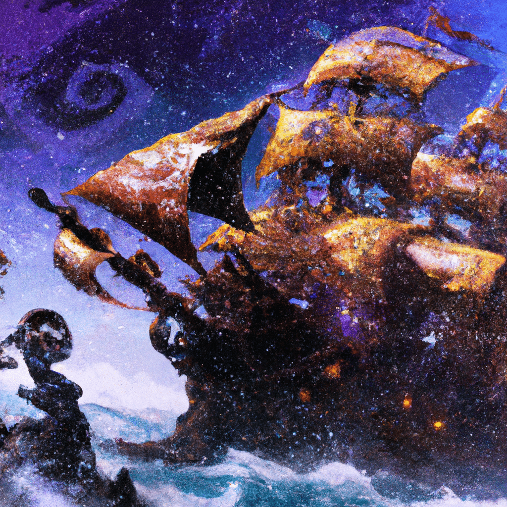 Prompt: In the style of Romanticism, the image would depict a vast seascape during the Golden Age of Pirates. A colossal pirate ship, adorned with AI-infused technology, sails amidst stormy waves. The ship’s intricate design showcases the fusion of futuristic AI elements with traditional pirate aesthetics. Standing on the ship’s towering helm, a robotic pirate captain with a rugged and weathered appearance gazes intently towards the horizon. The mood of the image captures the sense of adventure, mystery, and the clash between technological advancement and traditional pirate culture.