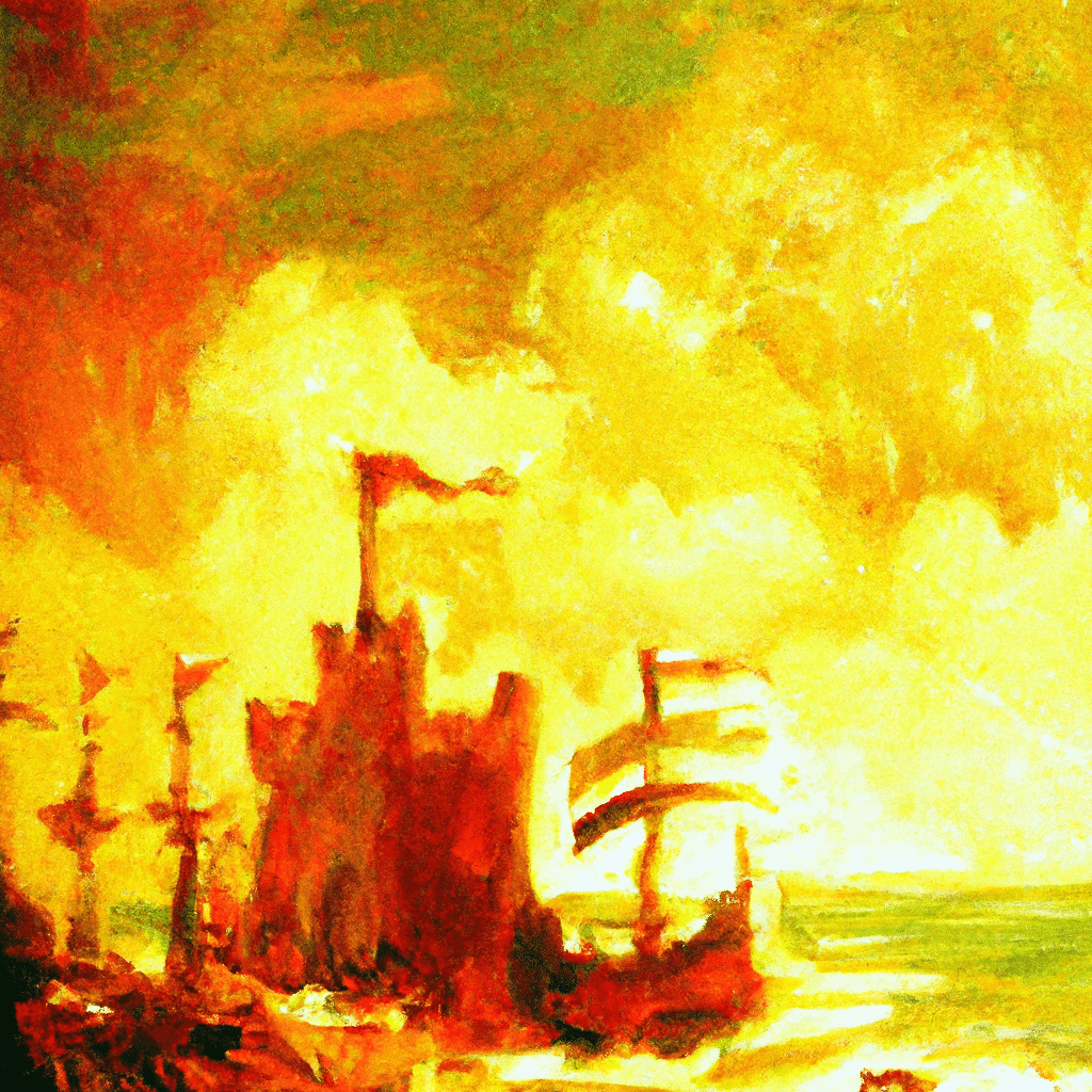 Prompt: Impressionism: A vibrant, whirlwind painting depicting a chaotic battle scene between AI robot pirates and royal guards, overlooking the sun-drenched shores of Gaza. The golden rays of the setting sun illuminate the turbulent waves as boats and robots clash while King Charles watches from a distance, his regal figure outlined by the warm glow. The brushstrokes capture the fluid motion of the conflict, infusing a dreamlike quality to the chaos, and emphasizing the emotional impact of the Israel-Gaza War during this golden age of pirates.