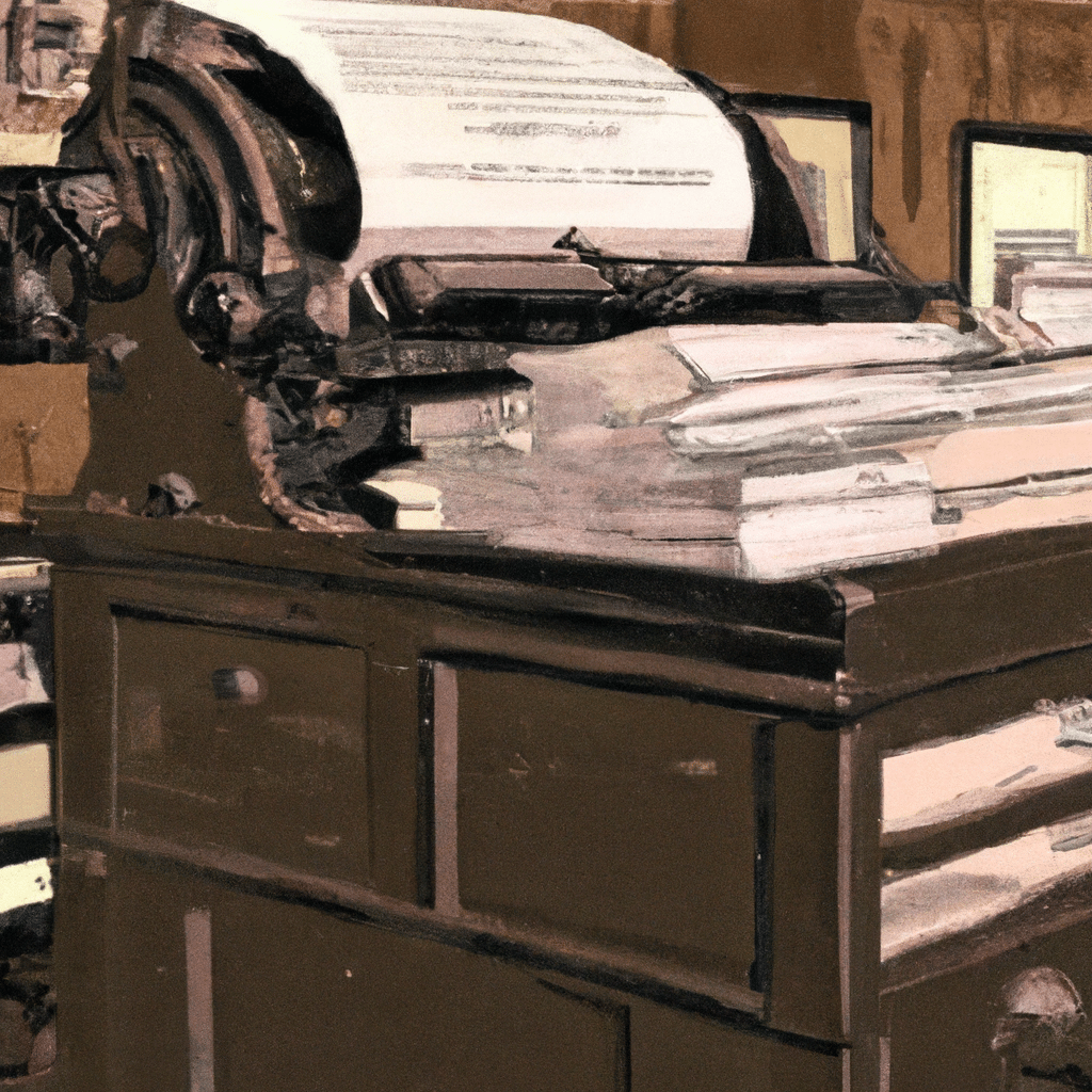 Prompt: In the style of Realism, the image would depict a scene within a historical newsroom, representative of the Clayton County Register. Vintage printing presses, rolls of newspaper, and ink pots scatter across the wooden space. Among these elements, however, are subtly placed anachronistic items, such as wording that forms lines of code on the papers and glowing wires interwoven in the ropes. The center focuses on two characters who were clearly from the modern era, recognizable as ex-Meta employees with their dark, sleek clothing, engaged in examining a newspaper that sparks with digital energy. One holds a magnifying glass highlighting the phantom presence of an AI entity – symbolizing the digital deception. Behind it all, through the room’s large wooden window, the silhouette of an AI robot pirate subtly references the Golden Age of Pirates. The blend of realistic items from different periods creates a powerful sense of intriguing paradoxical discord.