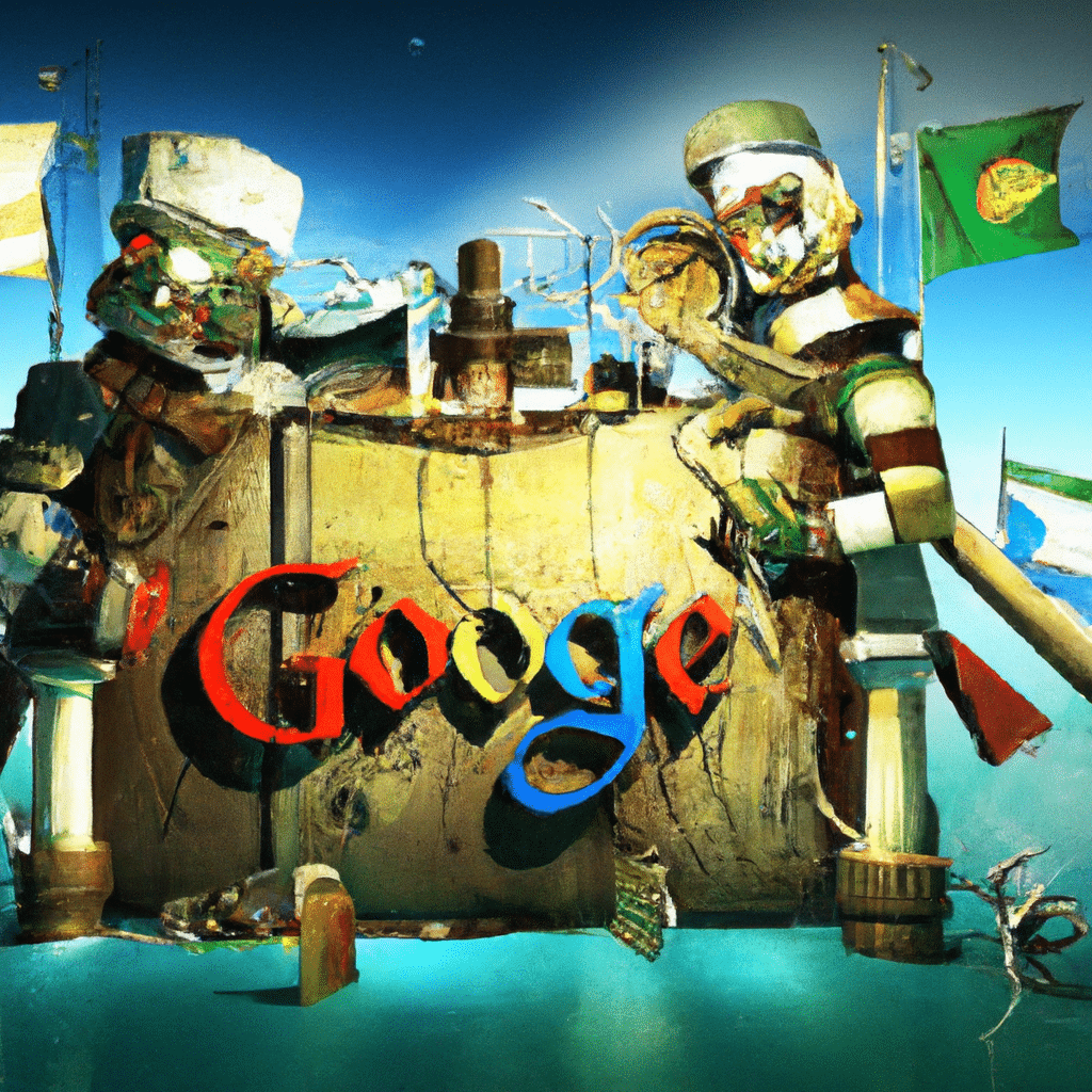 Prompt: In a style reflecting Futurism, the image will illustrate a dynamic scene set on a ship deck during the Golden Age of Pirates. At the center is a towering, metallic AI robot-pirate representing Google’s AI, with a jolly roger flag inscribed with ‘Google’. The robot-pirate is depicted in a victorious pose, holding a chess piece to symbolize strategic gaming power. In the background, a defeated robot-pirate symbolizing AlphaZero is partially submerged in a tumultuous sea. The scene is highly dynamic with strong lines and vibrant colors illustrating the AI’s triumph.