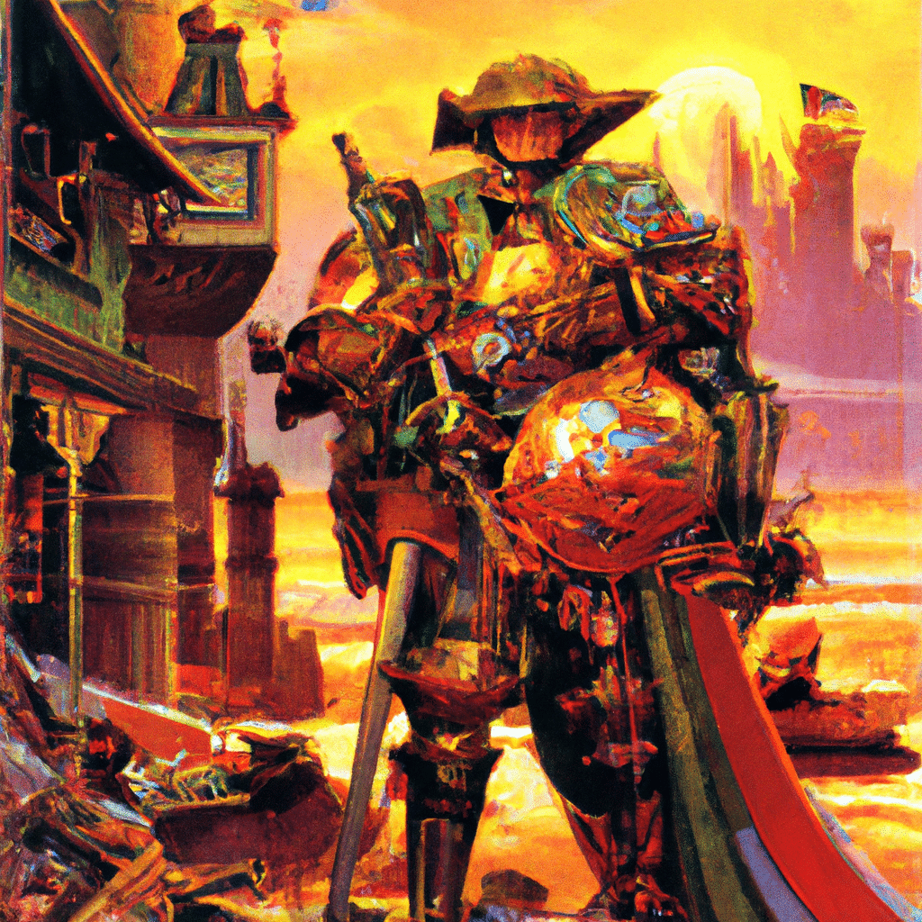 Prompt: In a Romanticism style, the image showcases a typical scene of the Golden Age of Pirates: a bustling port town, silhouetted against a sunset sky illuminated in hues of orange, red, and purple. The central figure is the AI robot pirate, dressed in characteristic attire with a futuristic twist, signifying its high technology origin. It’s in the process of looking at a map that’s glowing with holographic codes and structures that mimic Google’s colors – a symbol for Google’s AI.