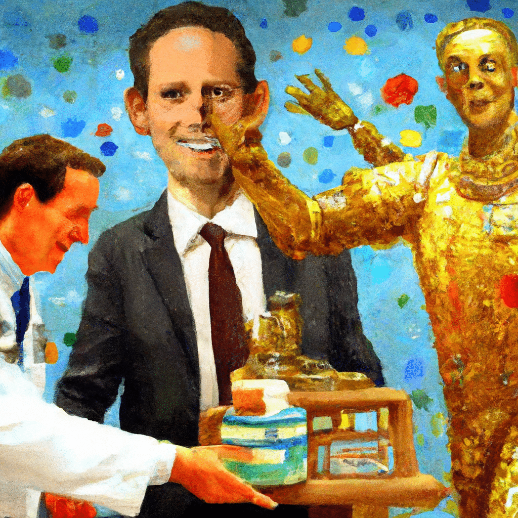 Prompt: The image portrays an Impressionist-style painting. The main focus is on Jeremy Hunt, the Health Secretary, appearing enthusiastic. He’s ceremoniously handing a gigantic, shimmering gold coin, representing the doubled funding, to a robotic figure dressed as an 18th-century scientist. This figure embodies the Alan Turing Institute. In the background, an AI Robot designed to resemble a pirate from the golden age is working on high-tech, futuristic research equipment, subtly indicating the theme. Wisps of colour blend the characters with the surroundings, typical of the Impressionist style.