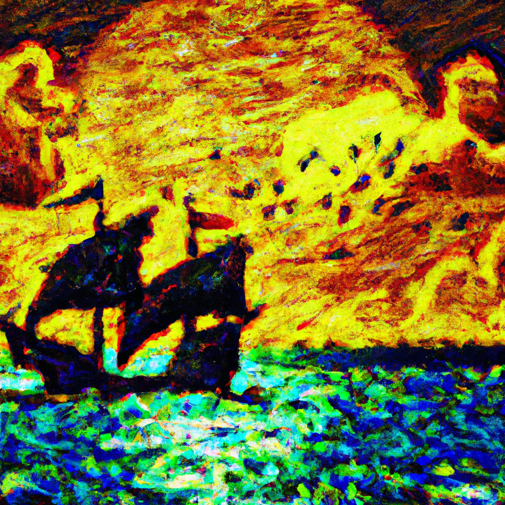 Prompt: In the Impressionism style, the image would portray a golden sunset on the high seas, with a majestic pirate ship sailing in the distance. The ship would have a futuristic design, blending modern technology with classic pirate aesthetics. The AI elements would be subtly incorporated into the scene, showing generative AI algorithms swirling in the clouds overhead, symbolizing the exploration and endless possibilities of this new technology.