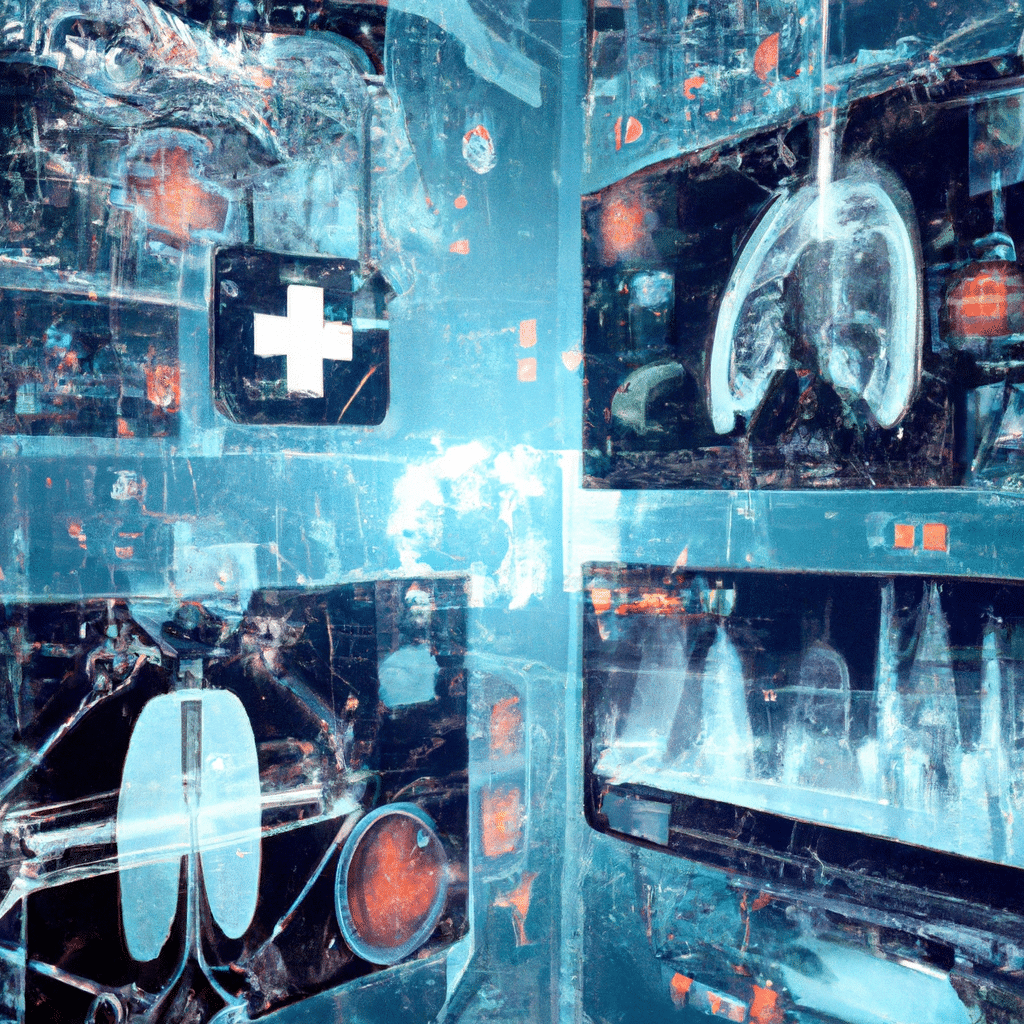 Prompt: **Image Description:** In a style reminiscent of Futurism, the artwork depicts a chaotic scene inside a high-tech healthcare facility overwhelmed by outdated machines and flickering screens. In the foreground, a frustrated healthcare worker interacts with a clunky, faded computer terminal, while in the background, sleek robots and advanced technology are halted by barriers made from old medical records and equipment. The composition features dynamic lines and blurred motion to convey urgency and struggle. Bright, contrasting colors represent innovation stifled by the dull grays of obsolete technology. A faint aura of hope emerges, showing glimpses of futuristic devices just out of reach, symbolizing the desire for progress.