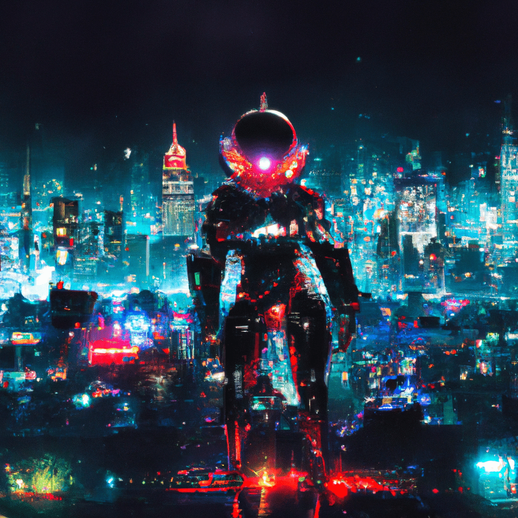 Description: The image portrays a futuristic scene with a backdrop of a bustling cybernetic cityscape illuminated by the neon lights of advanced technology. At the center, a larger-than-life AI robot pirate stands tall, adorned in a sleek black and silver metallic exoskeleton. Its glowing red eyes pierce through the darkness, exuding an air of mystery and power. The robot pirate holds a futuristic sword in one hand and a glowing orb of data in the other, symbolizing its mastery over information. Surrounding the pirate, countless digital screens display lines of code and encrypted data, illustrating the privacy concerns associated with GPTs. The overall futuristic aesthetic conveys the fusion of AI and piracy in the golden age of pirates, capturing the essence of OpenAI’s GPTs and their impact on privacy.
