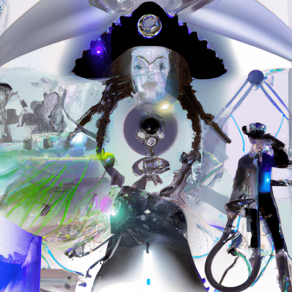 Prompt: In a Futurism art style, the image depicts a futuristic simulation room. At the center is Laurie Anderson, illustrated with precise, dynamic lines and multi-dimensional shapes interacting with an AI robot avatar of a pirate. The AI pirate is a shiny mechanical figure, with futuristic pirate clothes like a tricorn hat, braided metallic beard, and a peg leg. It stands next to a holographic steering wheel of a pirate ship. Splashes of iridescent lights, suggestive of the Golden Age of Pirates, fill the background, along with encrypted coding languages, portraying the AI element. Laser projections of a deceased partner hover by Anderson, imposing an eerie yet intriguing dissolution of human and machine boundaries.