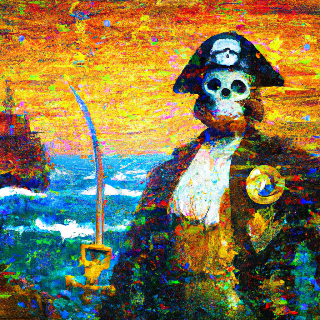 Prompt: In the impressionistic style, the image unfolds a dramatic seascape during the Golden Age of Pirates. An AI robot pirate, distinguishable with futuristic metallic limbs and a skull and crossbones on its digital screen face, stands in the foreground. It gallantly wears a tricorn hat with an embedded Google logo. Behind it is a sinking ship labeled “RIP Bard” in cracked and peeling paint. The robot spyglass shows a disappearing chat window, symbolizing the end of the Google AI Chatbot. The sunset sky and chaotic sea mirror the melancholy of the moment.