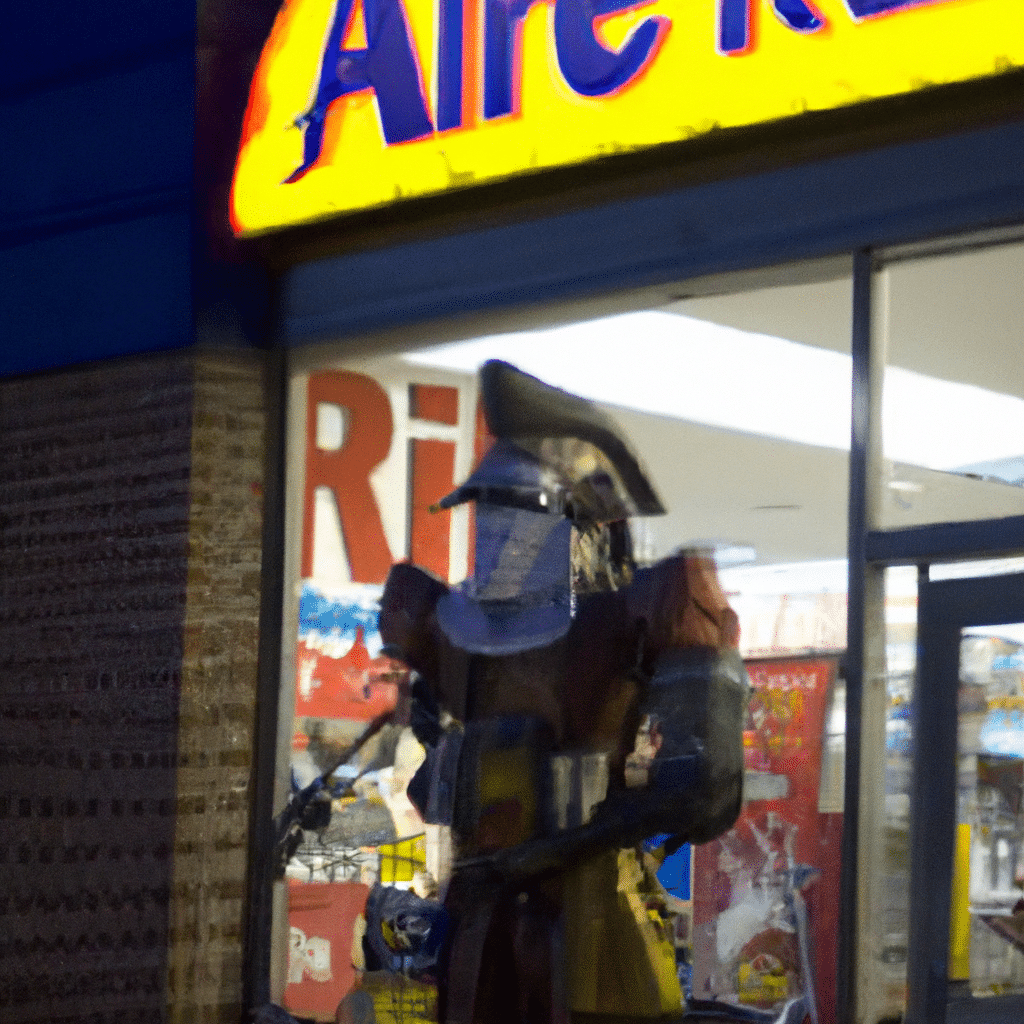 Prompt: In the style of Realism, the image features a Rite Aid storefront in the background, subtly underlit to create an ambience of unease. Focus is on a large, AI Robot Pirate, standing stoic; its mechanical parrot perched on the shoulder, both constructed in detail showcasing advanced tech from the Golden Age of Pirates. The pirate has a screen on its face, displaying a facial recognition interface with numerous faces being scanned and identified with red, “False Positive” tags. Customers with uncertain expressions walk past or interact with the Pirate, their privacy invaded, illustrating the privacy concerns depicted visually as ghostly overlaid pictures of their faces, emanating from the Pirate’s scanning system.