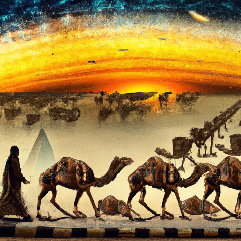 Prompt: In a futurism style, the image shows a landscape depicting an intertwining of the traditional Silk Road and the digital world. There is a mix of camels and digital pixels on a merchant trail from the desert trailing off into an ethereal, digital horizon, seamlessly transitioning from old to new. Standing central is the figure of Steven Jones, a half-human-half-robot, dressed like a pirate with an AI robotic parrot on his shoulder. His eyepatch glows with digital circuits symbolizing AI. He holds a scroll, which when closer look, is a string of binary codes, showing the way forward. The blending of the Golden Age pirates with modern AI technology underlines the concept of revival.