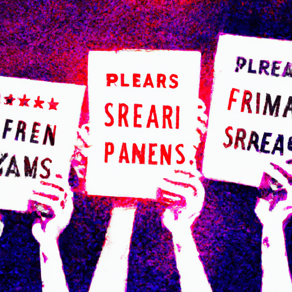 Prompt: **Visual Description:** An Impressionist-style painting depicting a charismatic figure resembling a modern-day leader, standing at the forefront of a vibrant gathering of diverse media creators. They are passionately discussing creative work, with digital tools and classic media elements blending harmoniously. In the background, waves of a vast ocean reflect the golden hues of a setting sun, symbolizing a new era. Elements of robotic pirates, like metallic parrot companions and high-tech ships, sail in the distance. Floating scrolls of parchment with words of freedom flutter in the breeze, showcasing messages of support for fair compensation in the evolving digital landscape. Overall, the scene exudes a sense of hope and unity within the creative community.