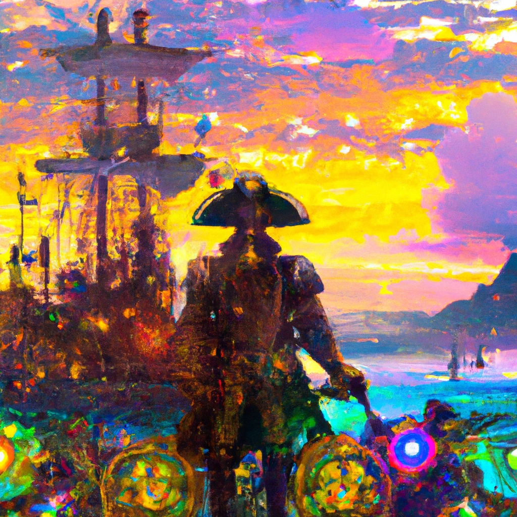Prompt: In the style of Impressionism, the image would portray a bustling, vibrant scene on a pirate ship amidst a golden sunset. The AI Robot Pirate captain, wearing a tricorn hat with feathers and a long coat adorned with futuristic gadgets, stands at the helm. The ship’s crew, a diverse mix of humans and AI robots, work together harmoniously, symbolizing employee unity. The horizon showcases a cluster of futuristic cities, representing the future of AI ethics. Colors are vivid and brushstrokes are loose, capturing the dynamic and ever-changing nature of the AI industry.
