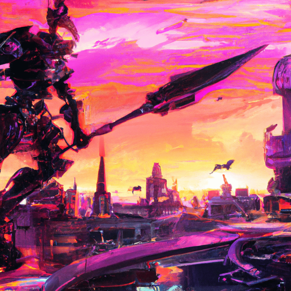 In this Futurism-inspired image, we see a bustling futuristic cityscape set against a vivid orange and pink sunset. The buildings are sleek and adorned with holographic displays, with hovering vehicles zooming through the air. In the foreground, a massive AI robot pirate with metallic limbs and an intricately designed exoskeleton stands tall, holding a futuristic cutlass. The robot pirate’s eyes glow with a vibrant blue light, showcasing its advanced AI capabilities. The Golden Age of Pirates is reimagined in this futuristic setting, where technology and AI have transformed the once dangerous and lawless seas into a high-tech battleground.