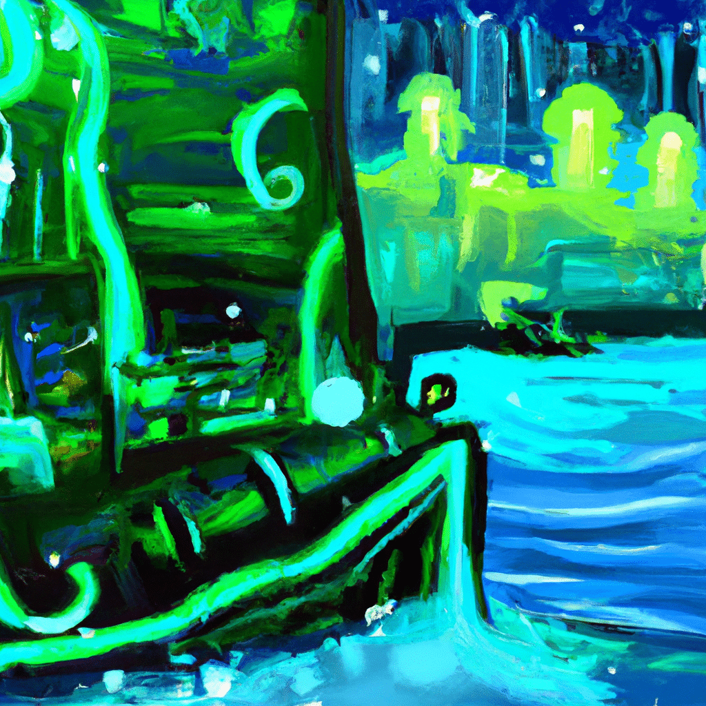 Prompt: Impressionism: In this image, we see a lively and colorful scene of a futuristic pirate ship sailing through turbulent waters. The ship is piloted by a crew of AI robots with intricate, mechanical limbs. The ship is adorned with neon lights and advanced technology, while also maintaining a sense of mystery and danger. The waves are depicted with loose brushstrokes and vibrant colors, creating a sense of movement and energy. In the background, we see a cityscape that blends both futuristic skyscrapers and elements of classical pirate architecture. This image captures the essence of the Golden Age of Pirates infused with the futuristic aesthetic of AI technology, creating a truly unique and captivating scene.
