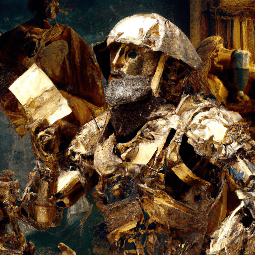 Prompt: In the style of Romanticism to highlight the emotional aspect of the scene, the image portrays a life-sized AI robotic pirate intricately designed with gold and silver pieces, usable during the Golden Age of Pirates. The AI Pirate is stationed in a reconstructed library in Pompeii, surrounded by smoky ruins. In its hands, it gently holds charred papyrus scrolls. Its facial features bear an expression of focused intelligence as its mechanical eyes scan and decipher the ancient script on the scrolls. Subtle lighting emphasizes the contrasts between the robot and the charred environment, symbolically linking the past and the future.