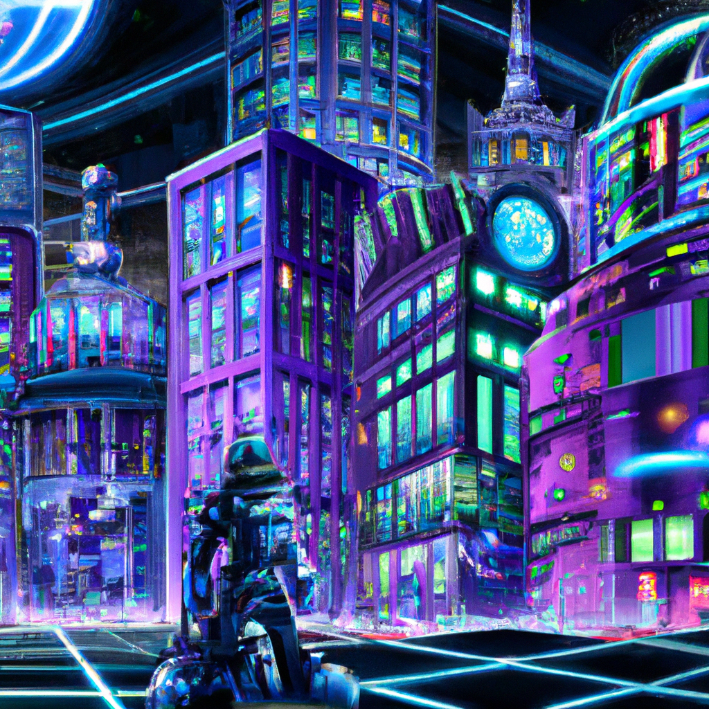 Prompt: Using the Realism art style, the image illustrates a futuristic Glasgow cityscape at night lit with neon lights. The House of Illuminati stands in the center, looking more like a metallic fortress with digital screens showing colourful dazzling codes, symbolizing the digital world of Willy Wonka. In the forefront, the centerpiece would be an AI Robot dressed as Willy Wonka, complete with a top hat and cane but laden with pirate symbols such as a robot parrot on the shoulder. The AI robot is half unfurled, showcasing its digital glitches and bizarre nature, which visually emanates from a fiasco. This wacky depiction is a nod to the AI Robot Pirate theme, balanced with the mystic and eccentric homage to Willy Wonka and the Illuminati association.